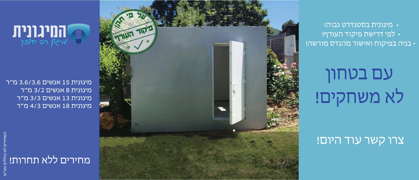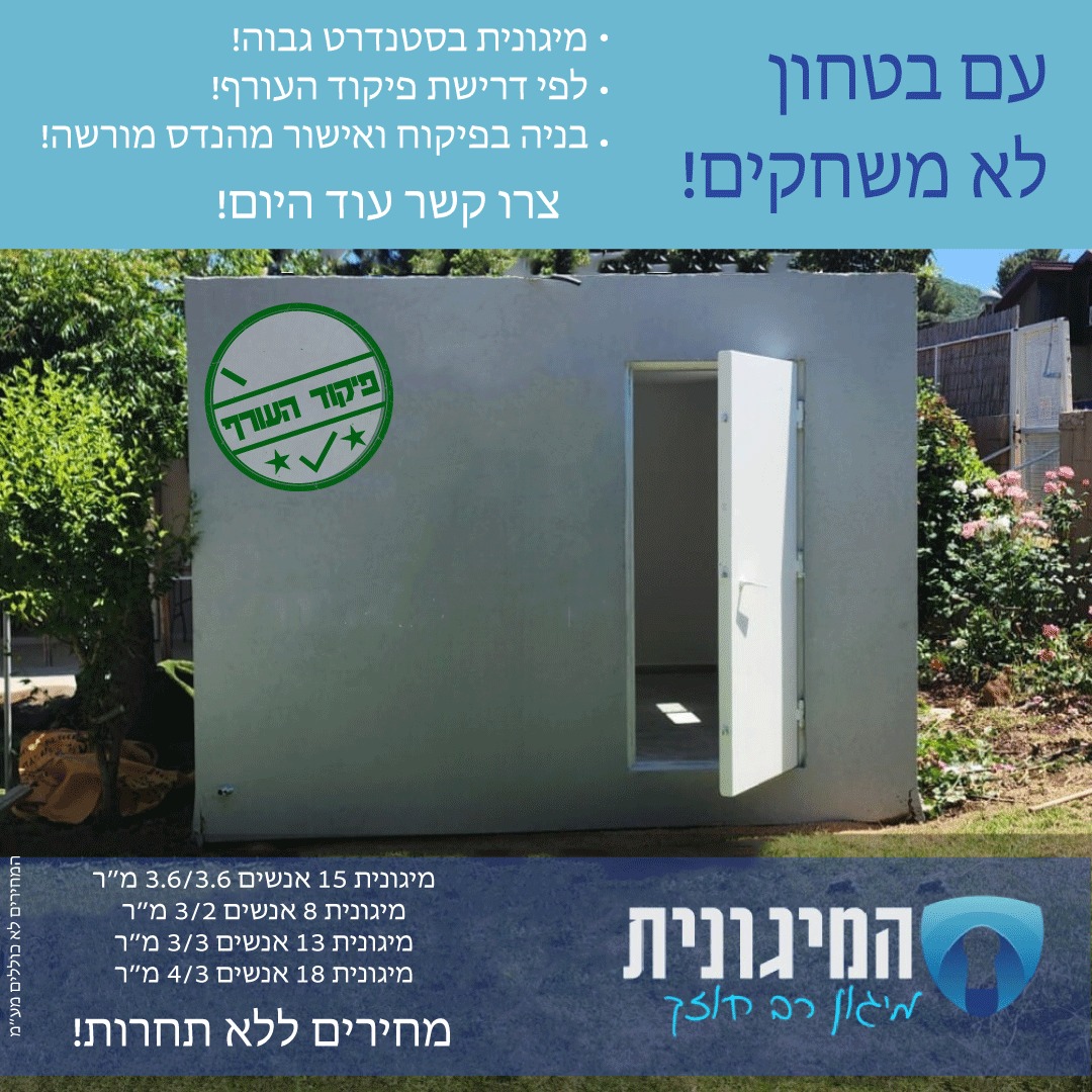 השם שלך טלפון עיר הניסיון שלנו – הביטחון שלכם עשרות שנות ניסיון בבניית מיגון אל תחכו לרגע האחרון! השאירו פרטים ונציגנו יחזרו אליכם בהקדם לשיחת ייעוץ ללא עלות. הצטרפו לאלפי לקוחות מרוצים שבחרו במיגונית . טלפון +972 52-968-7171 למה לבחור בנו? 3 ליווי אישי ייעוץ והכוונה לכל אורך התהליך, משלב התכנון ועד הביצוע. 2 בטיחות מעל הכל תכנון קפדני העומד בתקנים המחמירים ביותר. 1 איכות ללא פשרות חומרי בנייה מעולים ועמידים בפני פגיעות. 6 שדרוג מיגון קיים התאמת המיגון הקיים לדרישות העדכניות. 5 ממ``דים ומיגוניות המותאמים לצרכים הייחודיים שלכם ושל ביתכם. שקט נפשי: ידיעה שאתם מוגנים בצורה הטובה ביותר. 4 בניית ממ``דים מרחב מוגן חזק ובטוח, המשתלב באופן הרמוני בבית.
